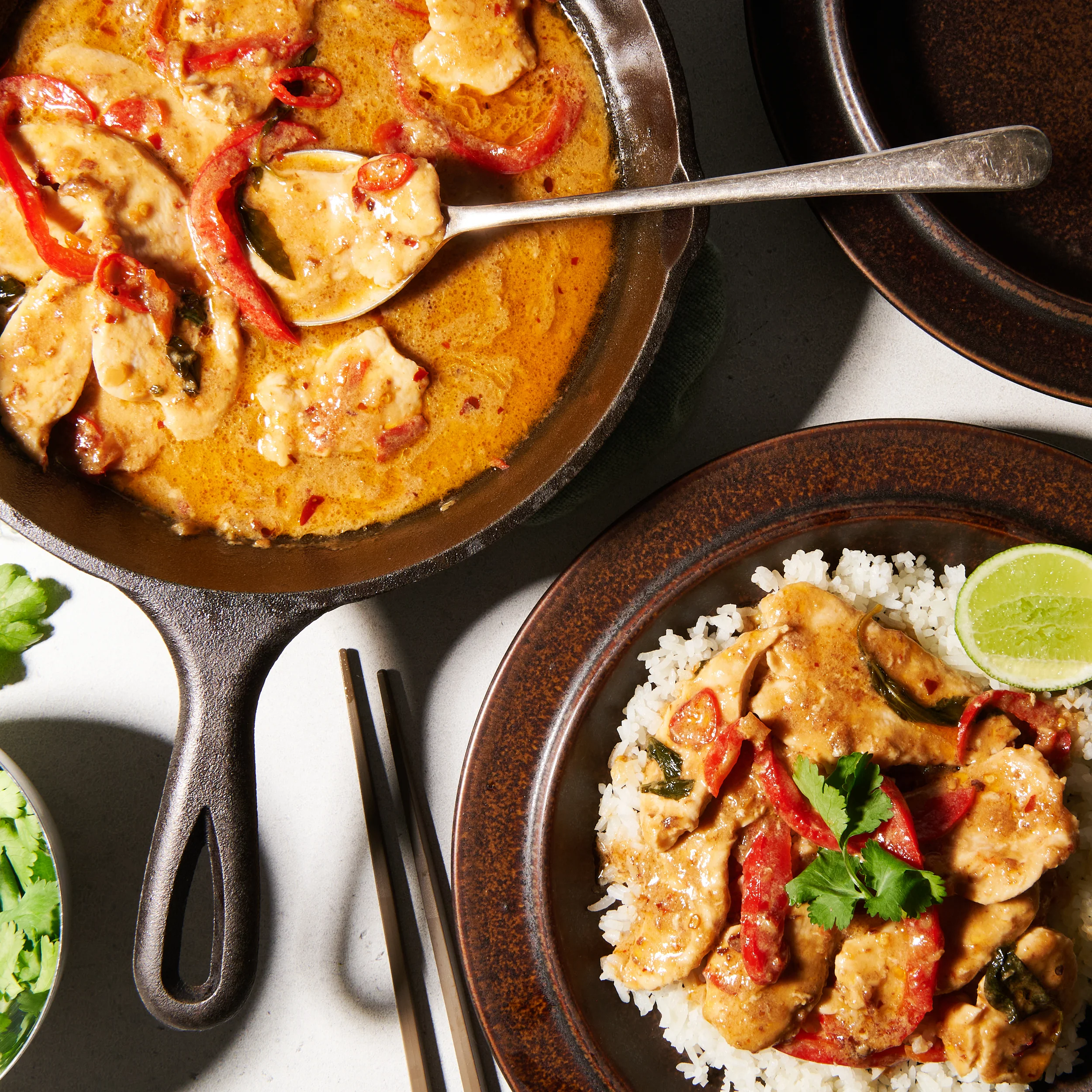 An irresistibly saucy dish (originally from the master of Thai cooking, David Thompson) which gets its funky, authentic edge from home-made chilli jam (gluttons for punishment, we are), used both as a marinade for sliced, uncooked, free-range breast fillet, and the base of the sauce with coconut cream, lime leaves and Thai basil. You just need to sear the chicken, pour in the sauce and dish up over coconut rice.